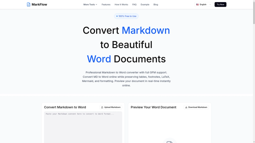 MarkFlow converts Markdown (.md/.markdown) files into professionally formatted Word documents (.docx and .doc) directly in your browser. It preserves GitHub Flavored Markdown (GFM) features and provides a live preview so you can validate formatting before downloading.