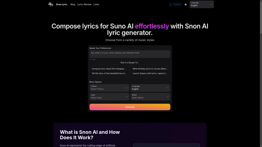 Snon AI (Snonlyric) is an AI-driven lyric generation service designed to produce polished, Suno AI–ready lyrics quickly. It combines contextual understanding, genre-specific phrasing, and multilingual support to output lyrics formatted and tagged for direct use with Suno AI music generation. The interface offers configurable parameters (theme, style, mood, language) and quick presets to speed up prompt creation.